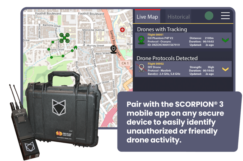 Whether out on patrol, traveling in a motorcade, or securing a perimeter – SCORPION® 3 detects drone threats automatically by creating a protective dome around the user. If an unauthorized drone enters this space, Scorpion automatically tracks and identifies operator location, allowing law enforcement, tactical units, and security personnel to focus on defending critical assets.